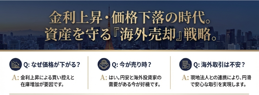 はい。不動産下落傾向が見えると一気に中心地から下がり始め、地方に波及していきます。これはバブル崩壊時の歴史が証明しています。今マンションが売れなくなったなど言われ始めており、その傾向が見え始めています。金利が上がることで不動産価格が下落するのなら、今のうちに金利上昇と関係の無い海外投資家に売却するのがベストだと考えます。特に一棟ビル等の収益物件は早めに売却されるのをオススメします。