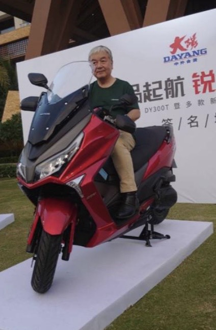※新作バイクの発表会で、自身が開発したバイクで、現地マスコミから取材を受ける神戸啓文会長